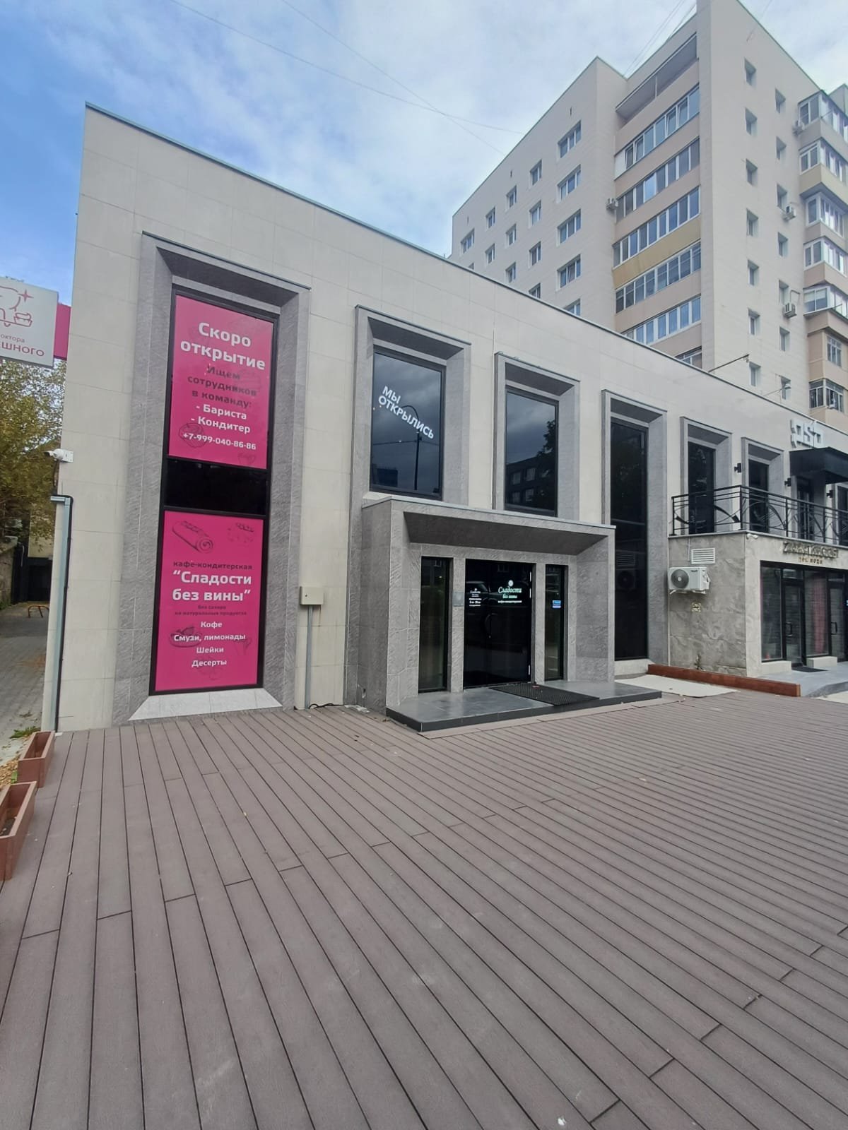 Совсем скоро планируется открытие во Владивостоке кафе-кондитерской «Сладости без вины», подготовка почти завершена и остались последние штрихи в оформлении. Осталось только изготовить и смонтировать вывеску и оклеить окна пленкой, за чем клиенты и обратились в Авеню. Ключевую информацию о торговой точке: время работы, юридические данные и т.п. решили сделать аппликацией из самоклеющейся пленки, которая монтируется на окна внутри помещения, а текст виден со стороны улицы. Одно из окон оформили большими по размеру плакатами на пленке, чтобы проинформировать и скором открытии точки и поиске сотрудников. В данном случае это удобное решение для оформления окон по нескольким причинам: